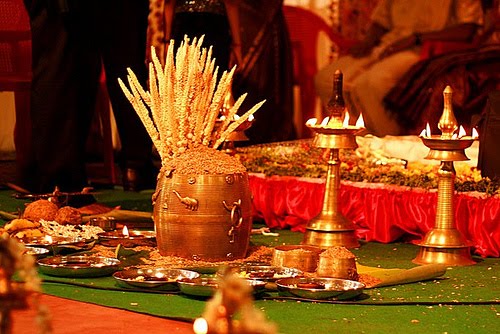 Held a day before the wedding, the pre-nuptial ceremony involves the bride and groom receiving blessings from their loved ones at functions hosted in their respective homes. It is often followed by a feast.