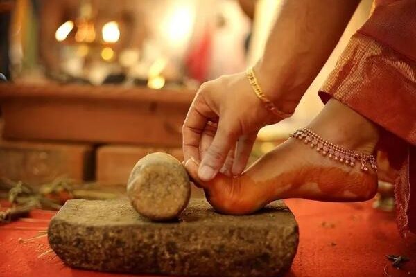 In this final ritual, the groom and the bride sit on the ground facing each other with their foreheads touching. The bride pours rice into the holy fire as the priest chants, after which the groom puts the bride’s foot on a grinding stone that symbolizes her leaving her family for a new home.